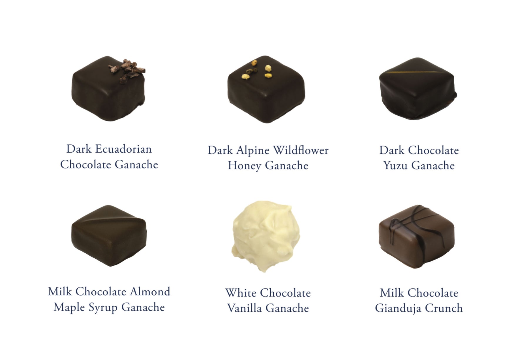 Ingredients: Dark Chocolate 34% (Cocoa Mass, Cane Sugar, Cocoa Butter, Emulsifier: Soya Lecithin, Milk Chocolate 19% (Cane Sugar, Cocoa Butter, Milk Powder, Cocoa Mass, Emulsifier: Soya Lecithin, White Chocolate 14% Sugar, Cocoa Butter, Milk Powder, Emulsifier. Soya Lecithin, Natural Vanilla Flavour), Whipping Cream (Cream (Milk), Stabiliser: Carrageenan), Hazelnut Paste, Humectants: Glycerine, Sorbitol, Clarified Butter ((Butterfat (Milk), Moisture), Almond Paste, Glucose Syrup, Yuzu Puree, Cream (Milk), Honey, Glucose Syrup, Maple Syrup, Invert Sugar Syrup, Unsalted Butter (Milk), Rice Crisp (Rice Flour, Wheat Flour, Sugar, Whey Powder (Milk), Malt Flour (Barley), Salt, Rapeseed Oil, Emulsifier: Soya Lecithin), Yuzu Flavouring, Cocoa Butter, Cocoa Nibs, Bitter Almond Flavouring (Flavouring, Almond Oil, Water, Sunflower Oil, Thickener: Xanthan Gum, Acidity Regulator: Citric Acid, Preservative: Potassium Sorbate), Preservative: Sorbic Acid, Bee Pollen, Colouring (Potassium Aluminium Silicate, Iron Oxide, Curcumin, Gum Arabic, Maltodextrin), Acidity Regulator: Citric Acid, Crystallized Yuzu Zest (Yuzu, Sugar, Reduced Starched Syrup, Antioxidant: Ascorbic Acid. Dark Chocolate contains cocoa solids 72% minimum. Milk Chocolate contains cocoa solids 36% minimum and mik solids 24% minimum. White chocolate contains cocoa solids 28% minimum and milk solids 22% minimum.