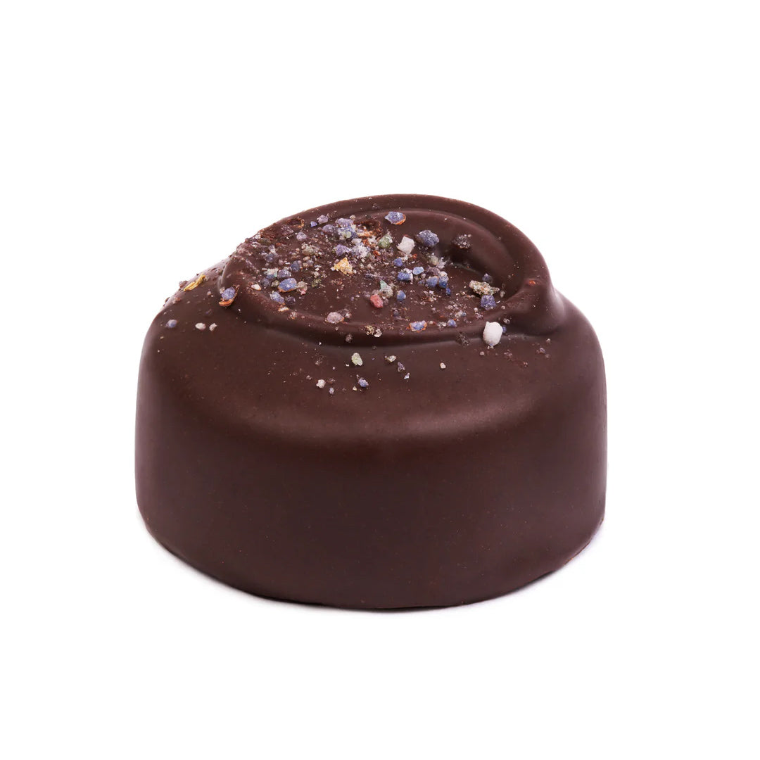 A most unusual fondant cream flavour. Herbaceous and earthy notes of lavender, sweetened by the fondant and balanced by the fruity and floral notes of dark chocolate.