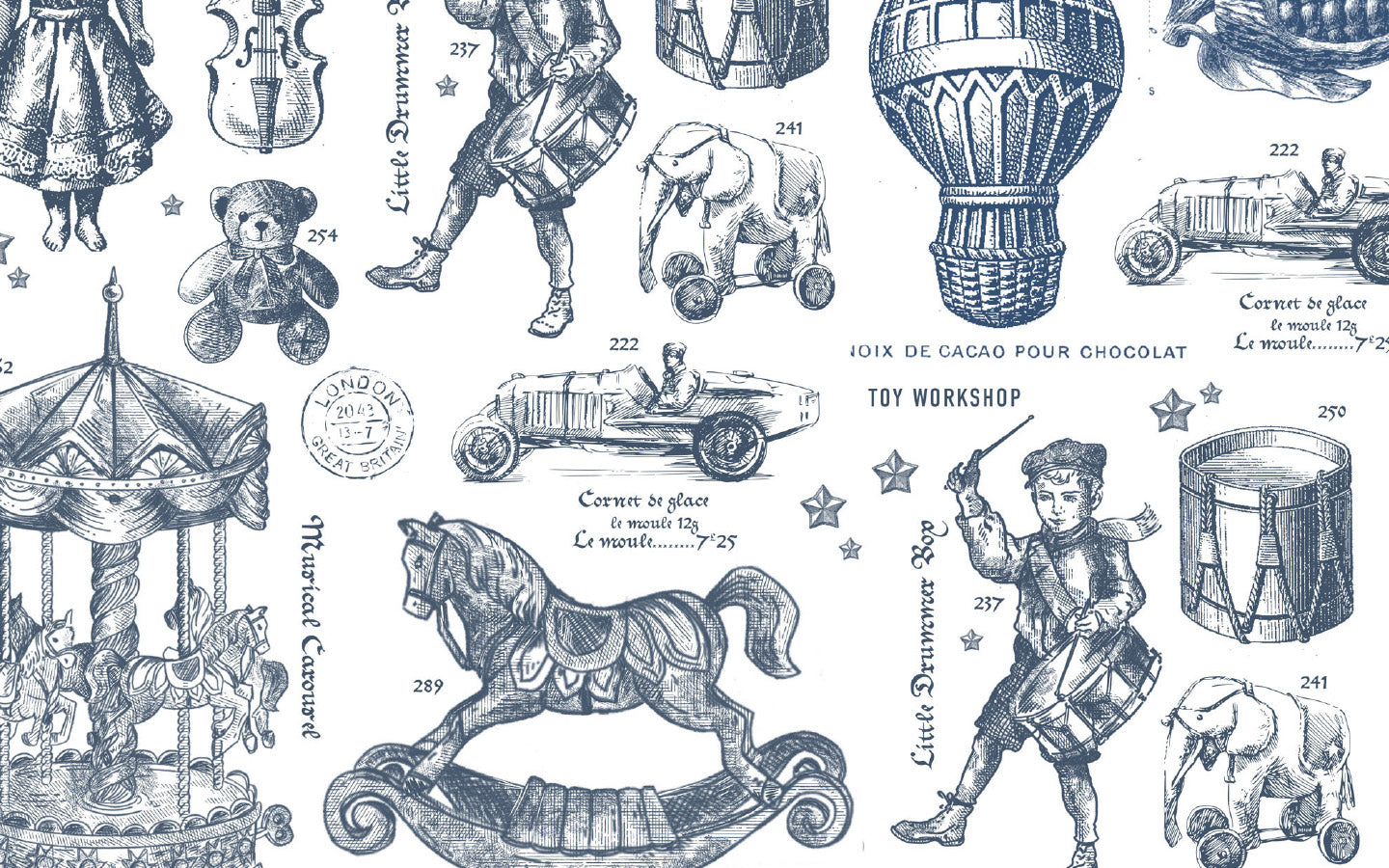 Our iconic toile has once again been re-imagined, this time to tell the store of a vintage toy workshop.